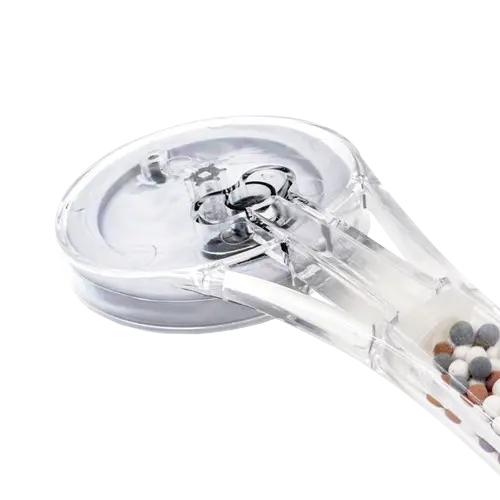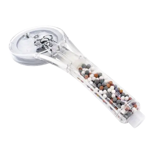 - Billes de tourmaline, germanium et argile : ces pierres naturelles filtrantes sont positionnées dans le manche de la douchette. Elles sont présentées comme permettant de neutraliser une partie du calcaire, du chlore, des métaux lourds et d’autres impuretés, afin d’obtenir une eau plus douce au contact de la peau et des cheveux.